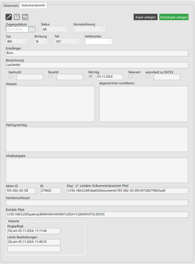 - Notizkopie anlegen: Ermöglicht das Anlegen eines Notizexemplars und das Importieren in die gewählte Akte mit angepasster Bezeichnung in den INT-Teil.