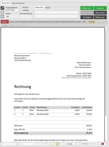 - Oberhalb des PDF-Readers werden die wichtigsten Daten zum Dokument angezeigt, die dort auch editiert werden können. Die Akteninfos sind die Notizen und Memos, die aus der jeweiligen Akteninformation übernommen werden.