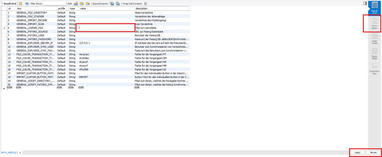 Um die Daten in einer Tabelle zu ändern, kann direkt ein Wert in der Tabelle per Doppelklick geändert werden. Übersichtlicher ist dies über den "Form Editor" (rechts zu sehen) für jeden einzelnen Datensatz. Anschließend kann über den "Apply"-Button gespeichert oder über den "Revert"-Button die Änderungen rückgängig gemacht werden.