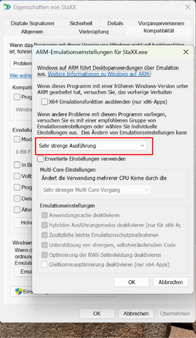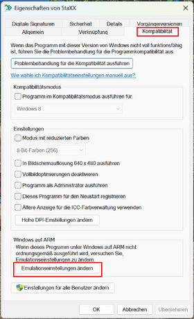 - Aufrufen der Registerkarte "Kompatibilität" und im unteren Bereich Emulationseinstellungen ändern